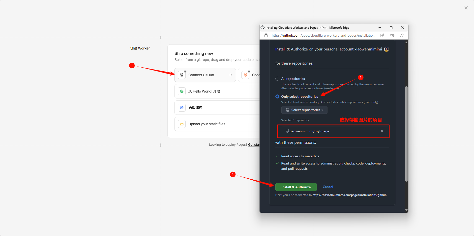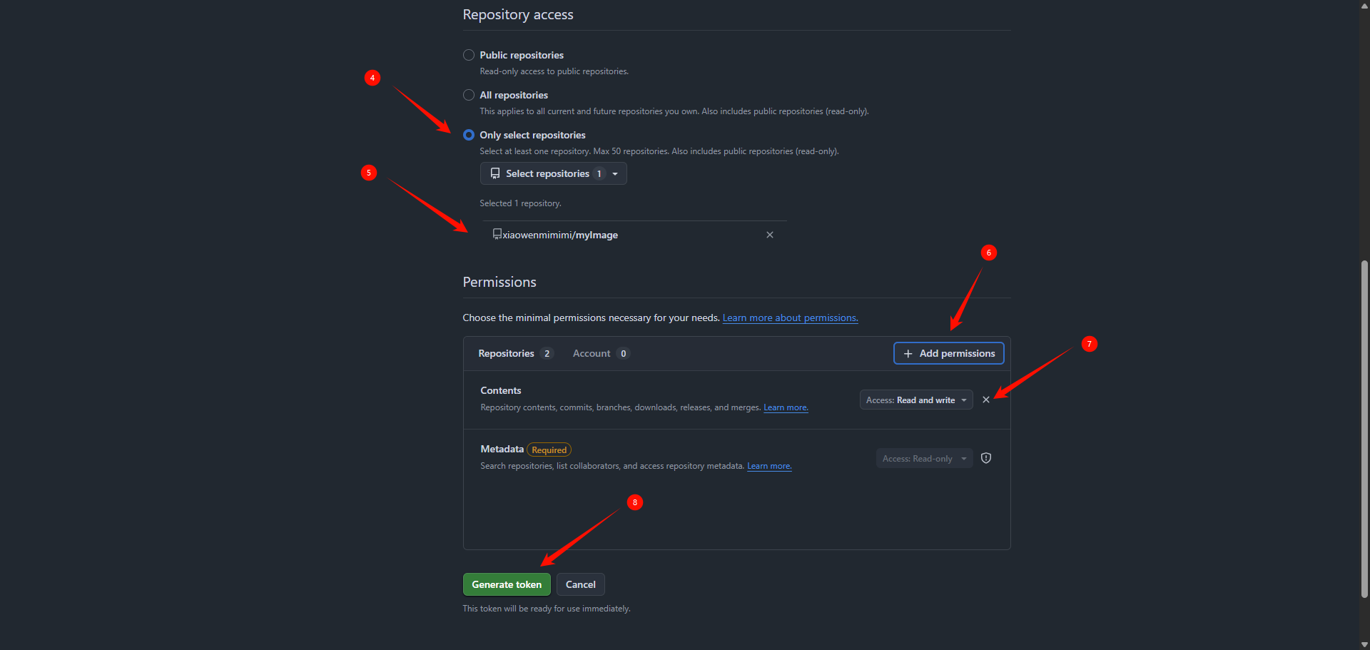 - Repository access:选择 Only select repositories,并勾选你的图床仓库(例如