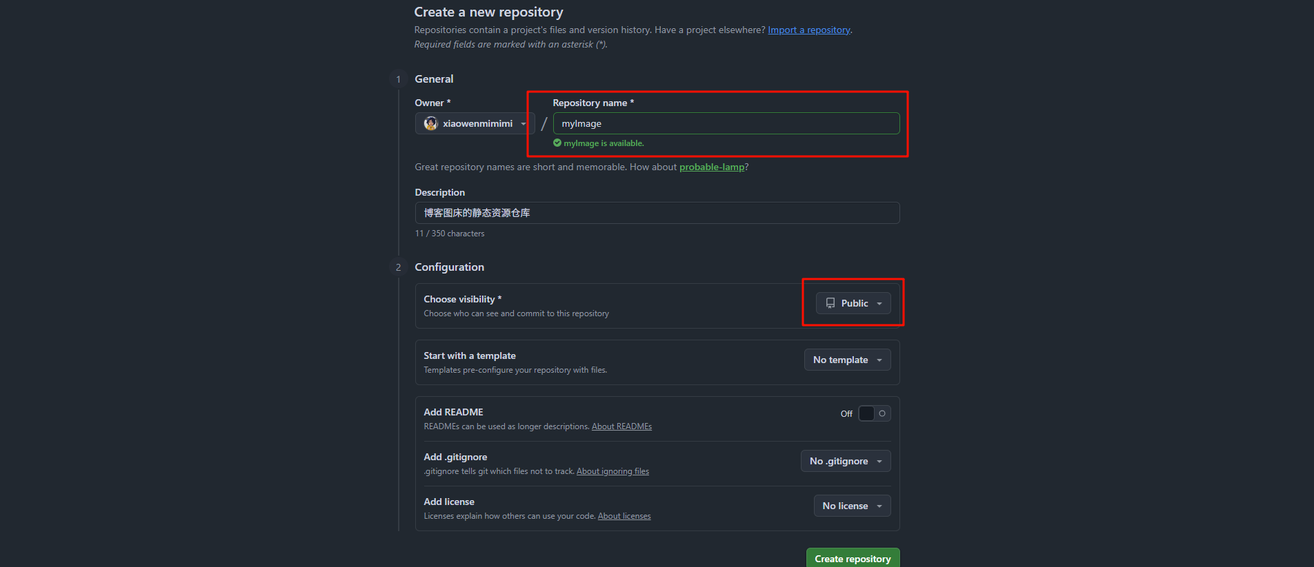 设置:名称:myImage描述:用于博客图床的静态资源仓库